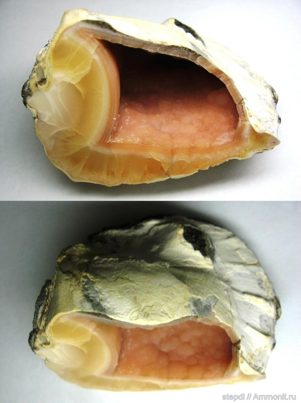 Псевдоморфоза родохрозита, кутнагорита и манганокальцита по раковине двустворчатого моллюска. Камыш-Бурунская мульда, карьер Е, Керченский полуостров, Российская Федерация. Нижний плиоцен, киммерийский ярус. Размер около 50 мм. Образец получен по обмену от Александра Деманкова, Керчь. Сбор 1987 года.