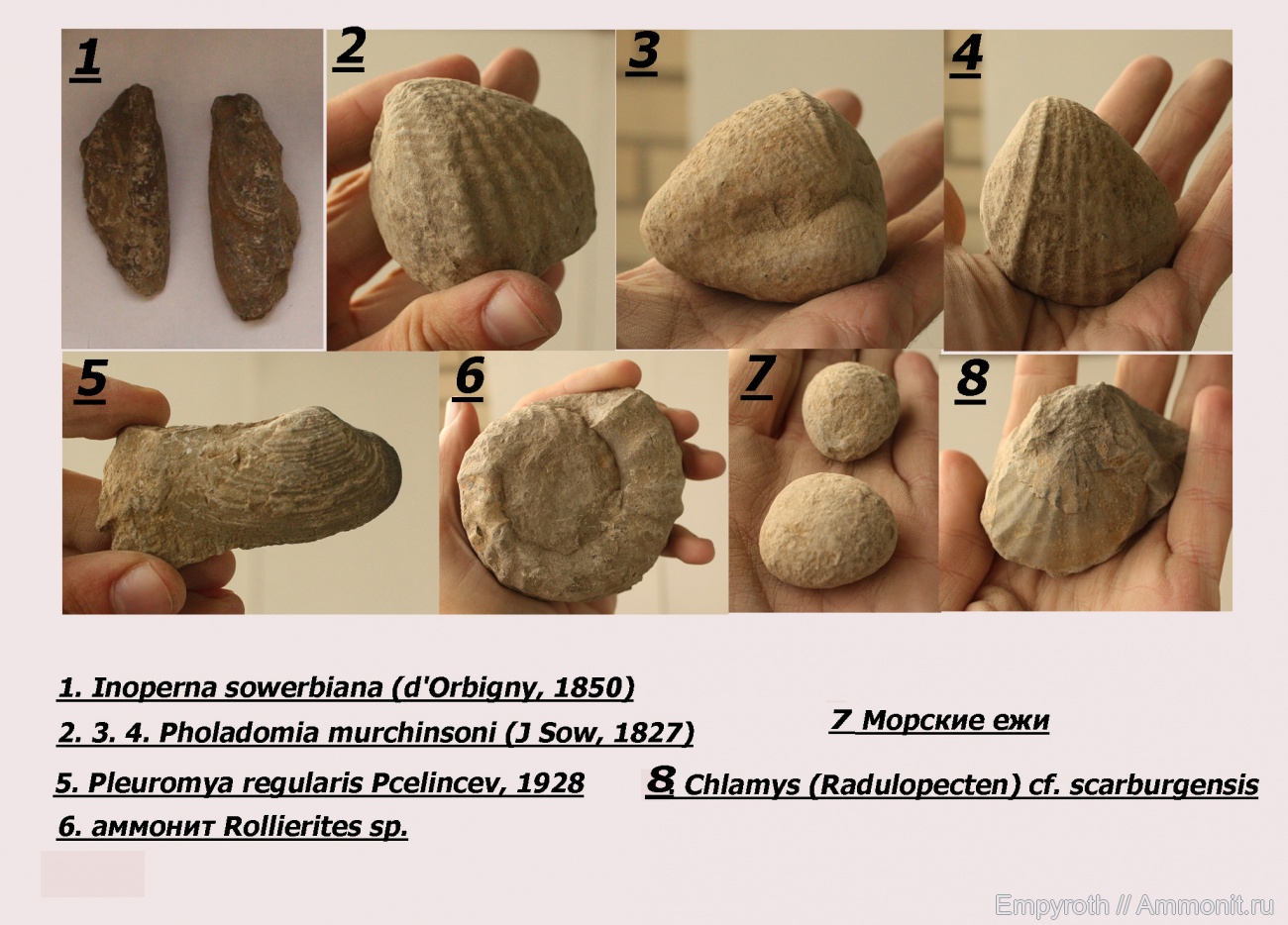 Опечаточка №7 ежи, №8 гребешок. Вот тут Разнообразие двустворчатых моллюсков юры Дагестана. . | ||||||