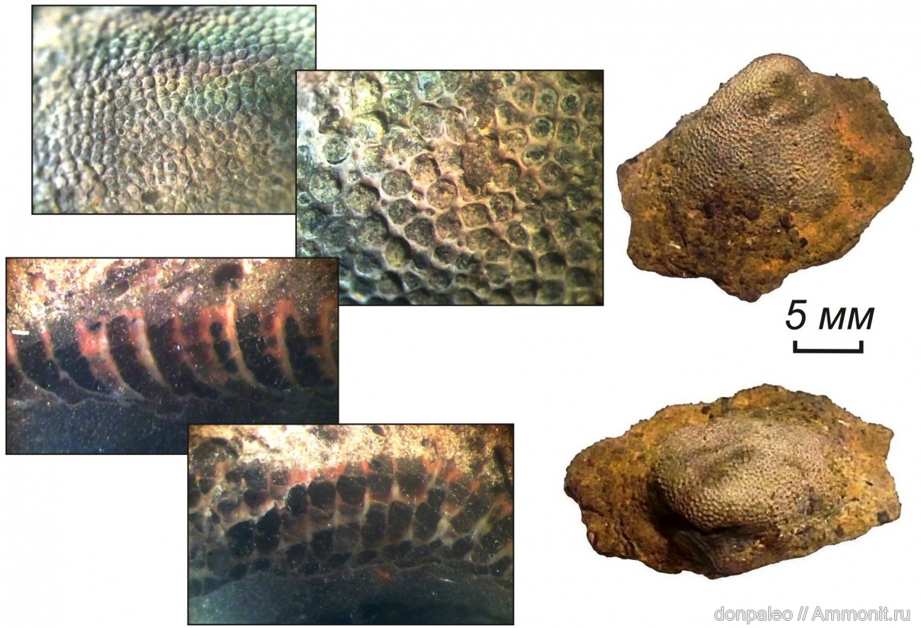 Колония мелких размеров, пластинчатой формы обрастающая раковину двустворчатого моллюска. Ячейки с многоугольными устьями хорошей сохранности. Глинистая светло-серая пачка известняка L7.