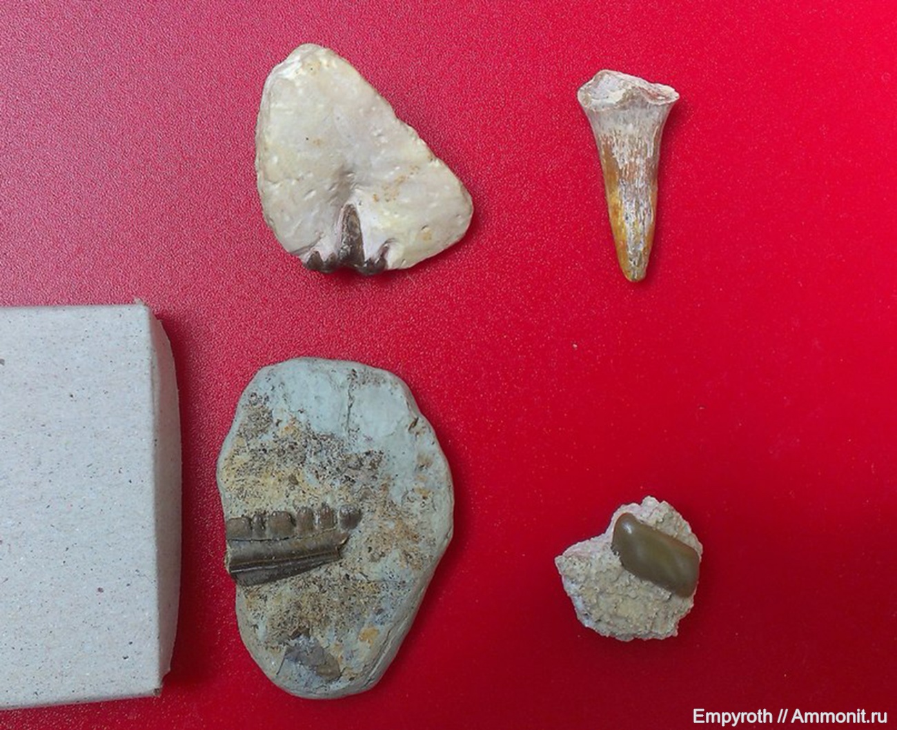На фотографии: округлые уплощенные зубки - Psephodus (внизу справа), половинка зуба Polyrhizodus (внизу слева) кладодонтные зубы (вверху), по видимому, принадлежат нижнекарбоновой акуле Saivodus. (поправьте, если ошибаюсь))