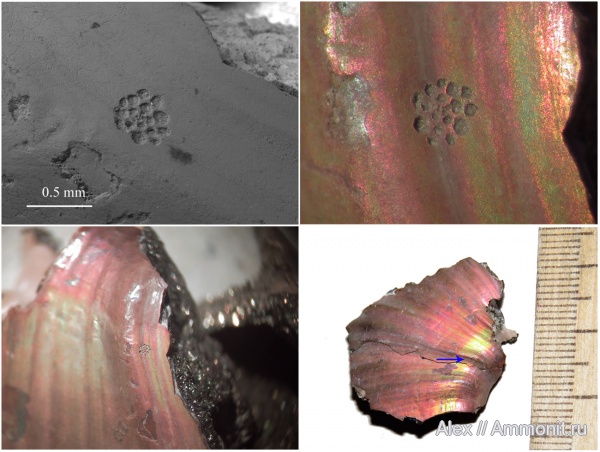 Пытаясь в очередной раз разгадать тайну загадочной желтой полосы, присутствующей в перламутровом слое раковин аммонитов Quenstedtoceras, я нашел на одном из фрагментов аммонита чей-то очень маленький след (на фото) - набор неглубоких ямок. Диаметр этого скопления ямок всего лишь пол-миллиметра и невооруженным глазом его практически невозможно разглядеть на блестящей поверхности раковины. Сначала я решил, что это след от прикрепленной фораминиферы (они иногда живут на поверхности раковин современных наутилусов), но поиски в этом направлении ни к чему не привели. Зато оказалось, что очень похожие следы оставляют ножки брахиопод, прикрепляющиеся к раковинам моллюсков и других брахиопод. Эти следы относят к ихнороду Podichnus. Судя по небольшому размеру следа брахиопода либо относилась к мелкому виду, либо прожила не очень долго (может быть из-за изменения концентрации кислорода в придонном слое). Жила она конечно на пустой раковине, лежавшей на дне келловейского моря.