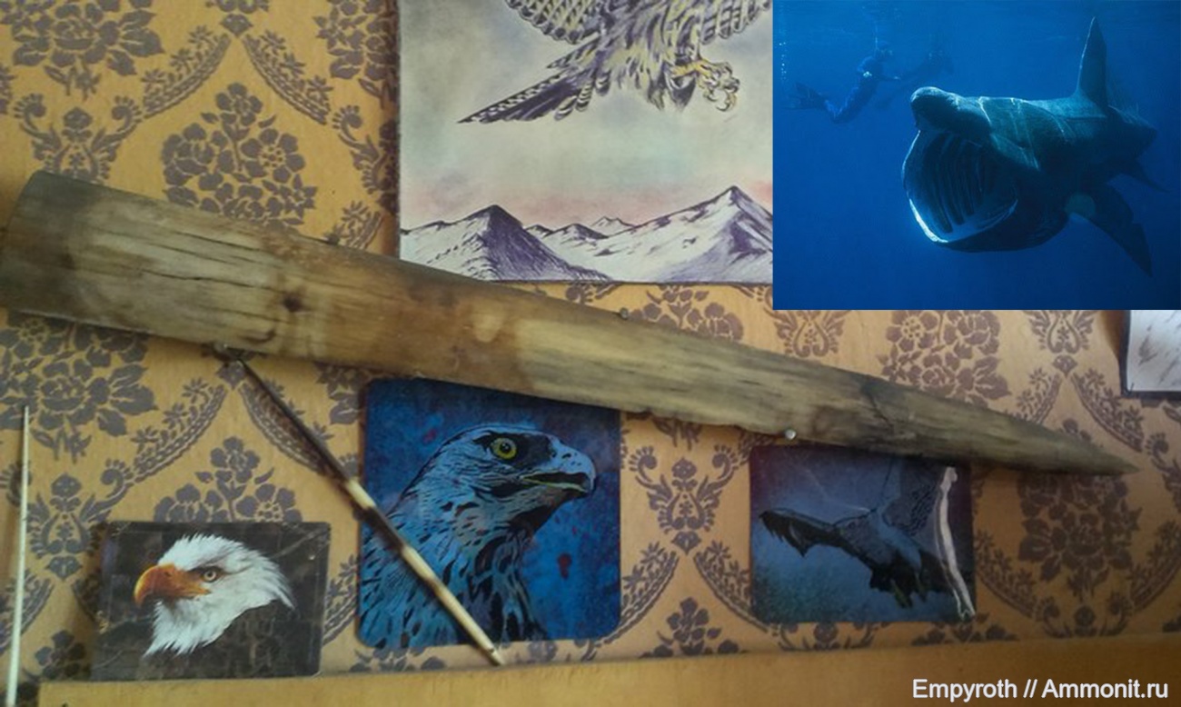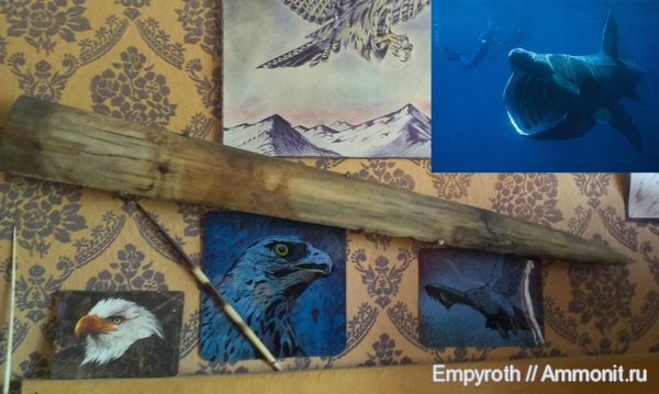 Вот такая вот штука попалась одному моему знакомому в отложениях готтерива (нижний мел) в районе Партизанского водохранилища (Крым). Длина такой "штуки" - более метра, она абсолюно прямая и с обоих сторон острая. Как видно на фотографии - он ее повесил на стену.