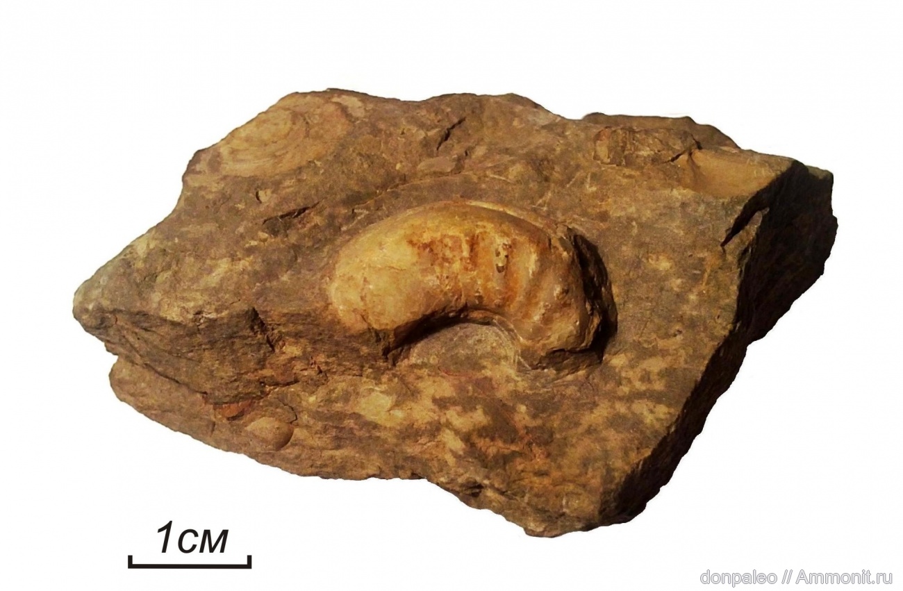 Фрагмент ядра раковины среднего размера. Наружная поверхность с редкими прямыми рёбрами равной величины. Глинистая пачка известняка L5. В известняке редко встречаются только обломки раковин.