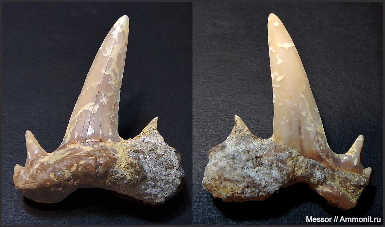 Исходно зуб выглядел так Scapanorhynchus, я решил, что это как-то непристойно, два вечера сидел с дремелем и стачивал этот адский песчаник, пока не стало страшно - корень довольно сложной конфигурации и спечен с песчаником намертво. В общем, что вылезло, то вылезло. Размер 23 мм в длину и приблизительно 18 мм в размахе крыльев корня.