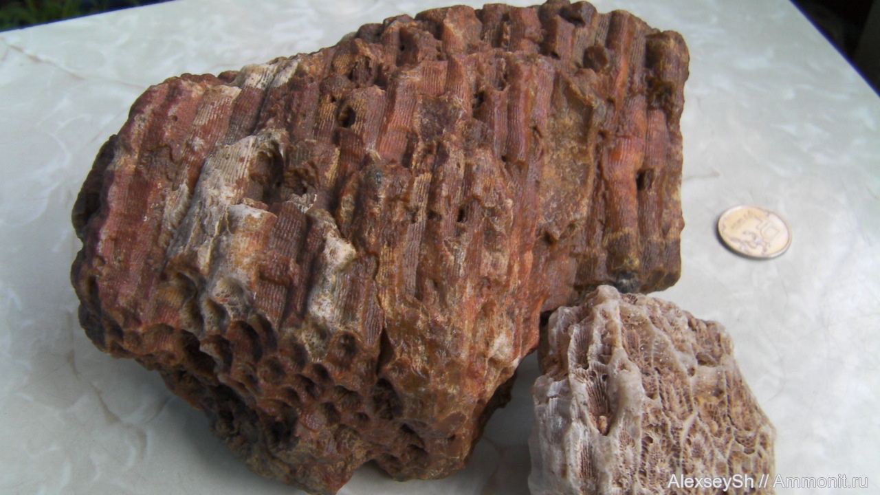 Северо-Восток ближайщее Подмосковье-находка в строительном отвале красной глины из котлована.Еще вопрос обратил внимание и видно это на фото дырки острые глубокие прямо в кремень-халцедоновой структуре образованные.Хищники в те времена кораллы такие ели? | ||||||