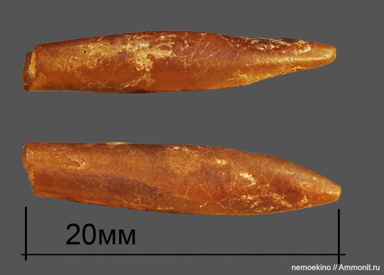 Небольшой, всего 20мм ростр белемнит Hibolites. Примерно 2/5 от конца имеется повреждение, кончик помят и провёрнут вдоль оси. Не знаю смог-ли передать на фото.