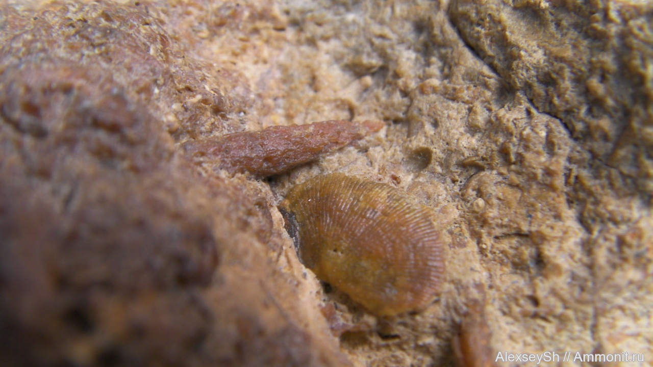 Красивая брахиопода и морского ежа игла.Для размера брахиопода накрывается рублевой монетой