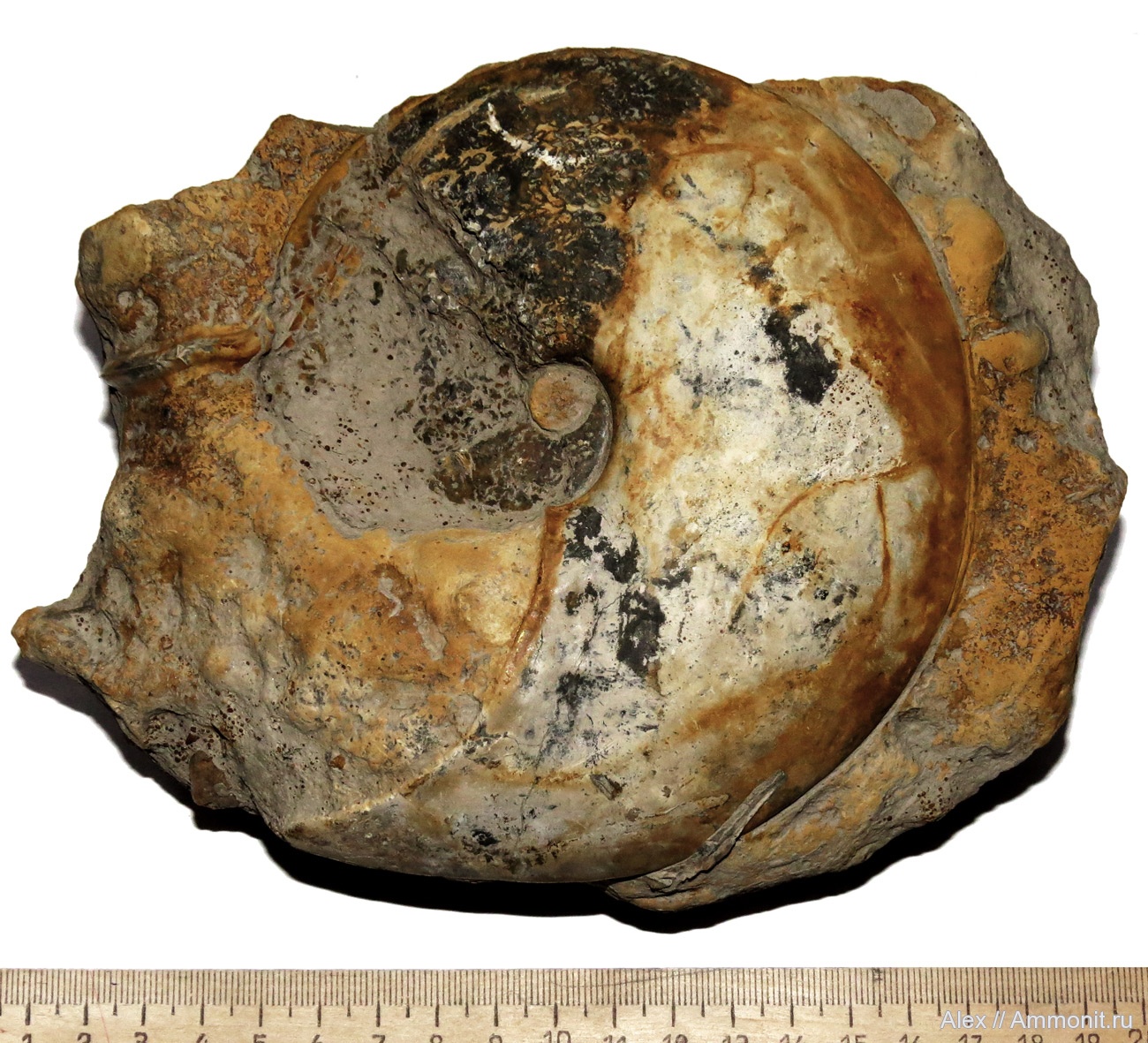 Очень интересна посмертная судьба этих аммонитов. О ней на примере такого же аммонита (названного Platychamoussetia funifera - об этом названии читайте комментарии к данному фото) рассказывал палеонтолог Андрей Сенников в публикации Беспокойная судьба древних окаменелостей. Эти аммониты окаменели, после чего снова оказались на поверхности морского дна, где и стали местом обитания серпул. Мой аммонит еще интереснее - крупная серпула на нем сохранилась частично, ее центральная часть раздавлена вместе с фрагмоконом. Выходит, что на тот момент, когда аммонит уже окаменел и стал частью конкреции, раковина с него облезла и на ядре поселилась серпула, его фрагмокон был ещё цел. Он оказался раздавлен уже потом, вместе с домиком серпулы, по-видимому после повторного захоронения, и раздавленные обломки в таком виде снова окаменели.