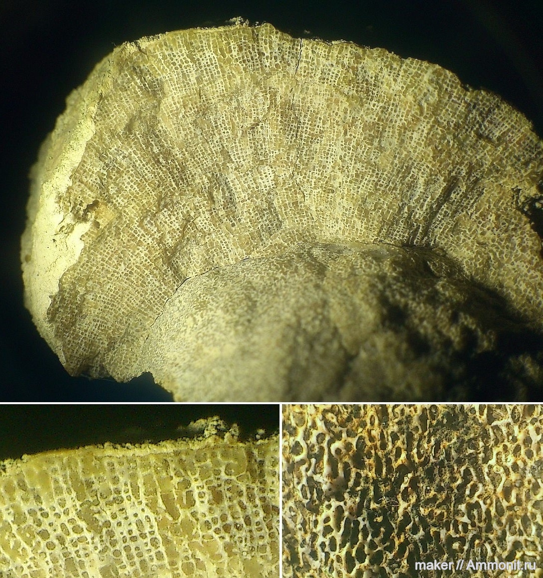 Ещё одна губка из Менестера. Вернее её продольное сечение. Часть слоев нарастания скололась, обнажив сетчатую структуру. Одно время здорово доставали такие губки при поиске останков Менестерского зверя! Замазанные глиной они очень напоминали губчатую костную ткань трубчатых костей (правая нижняя врезка). Сколько разочарований было с ними связано! Но пришло их время зарамсить проблему))).