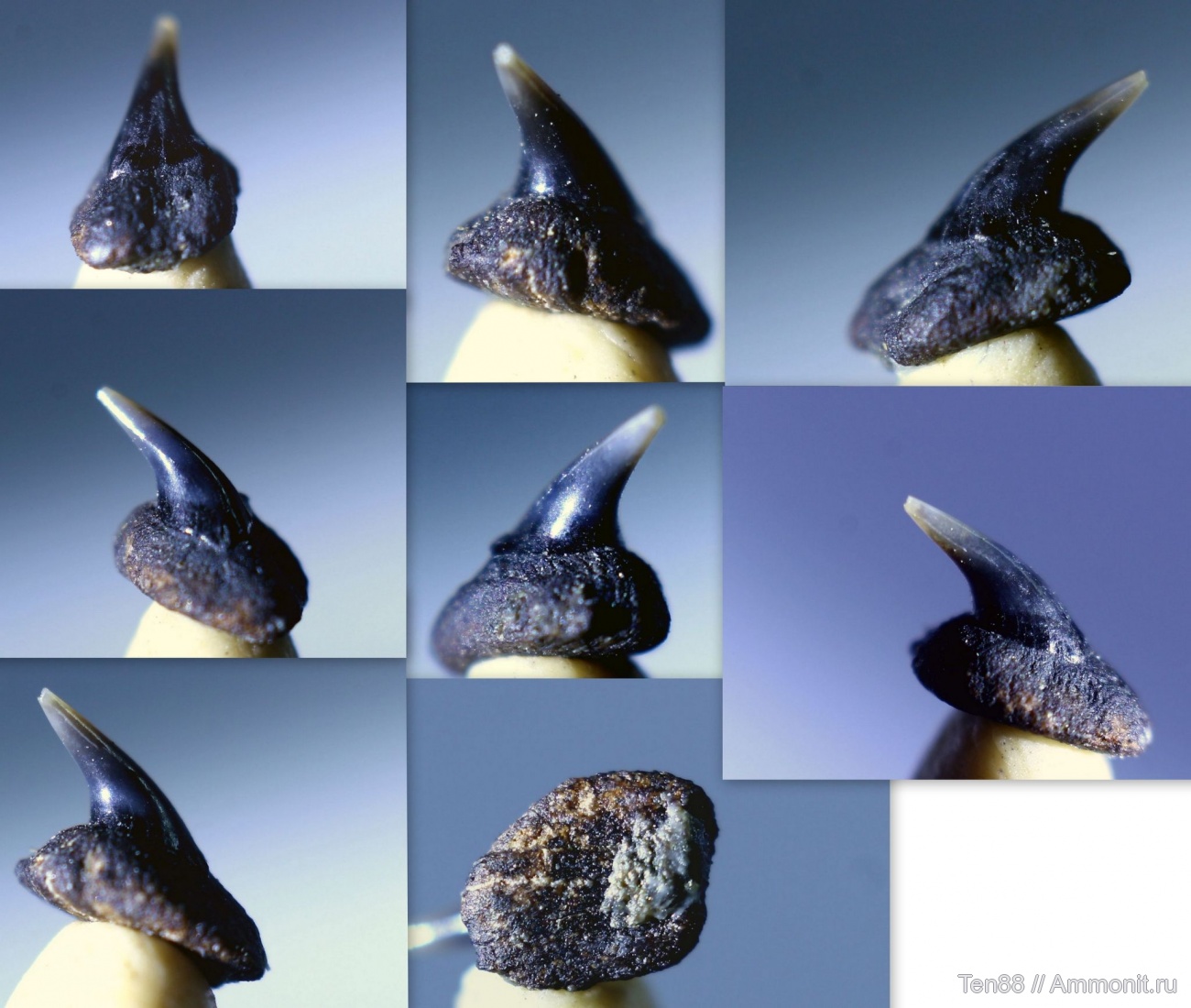 С большим трудом, но удалось обнаружить в остатках породы вот этого, практически идеального, малышка :)! Высота самого зубика почти 4 мм, ну и почти 2 мм корня делают его практически гигантом в 6 мм. :). Постаралась сфотографировать со всех возможных ракурсов.