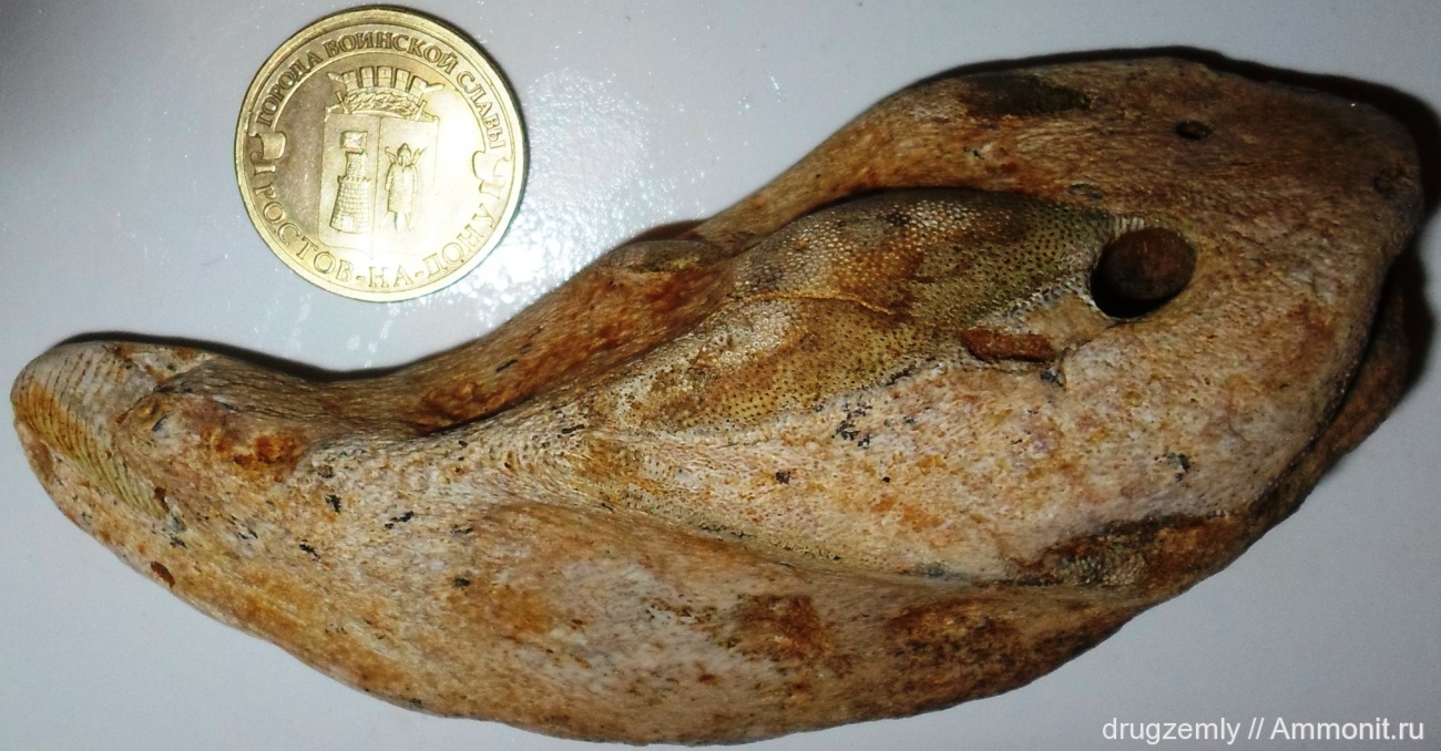 Могу согласится с определением и замечаниями Владимира, добавив, что несмотря на явное и сильное переотложение (есть даже сверление) - на мой взгляд это все же палеоцен-эоценовый вид, который можно определить как Edaphodon cf. bucklandi. Т.е. возможно здесь был размыт палеоцен, т.к. в кампане-маастрихте встречаются немного другие формы, с иной структурой срединного тритора (который у данного образца раздвоен, в центре).