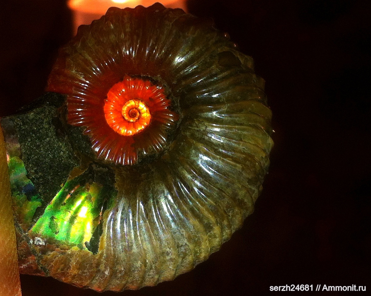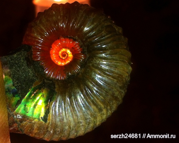 Необычно выглядит аммонит на просвет, можно подумать, что его центр сильно раскаленный! | ||||||