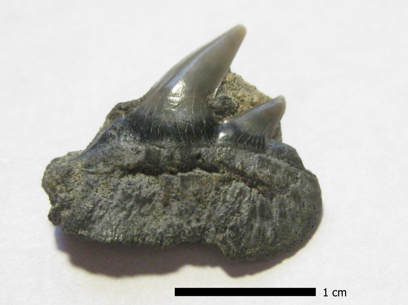 Верхний боковой Notorhynchus cf.kempi. Лингвальная сторона полностью залеплена крепкими фосфоритами, вероятность удалить их без появления повреждений на зубе очень низка.