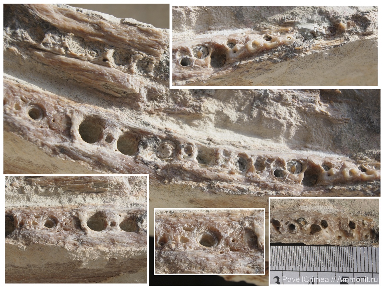 Отличается в деталях. От всех что удалось найти, в т.ч. и сауродона. Семейство видимо то, а дальше не понятно. Зубы очень плотно сидят, идеально круглые альвеолы по выпуклому конусу заужаются, кость широкая. Подробно не рассмотрю, т.к. чистить в "ноль" сам не буду, нет квалификации. В руки специалистам надо передать для описания. Кому? | ||||||