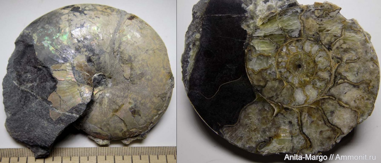 Интересное замещение кальцитом и пиритовые прожилки открылись при срезе.