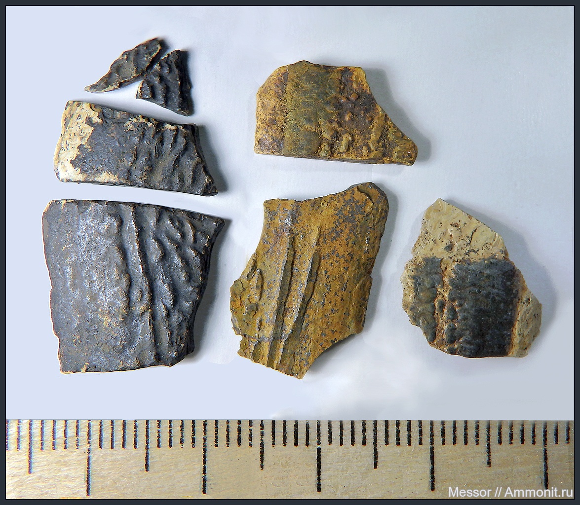 Все, кроме, крайнего правого фрагмента - из восточной стенки карьера, там почему-то целевой слой отличается от остальных стенок, он состоит большей частью (не полностью) из рыжего железистого песка, отсюда желтая окраска тамошних окаменелостей, ну, и видимо, железо на окраску там работает поливалентное, ещё и минералы марганца присутствуют (попадаются образцы с маленькими дендритиками), отсюда черная окраска. В остальных стенках по большей части серый песок, или песок, смешаный с красной глиной, объекты оттуда в основном или серые, или розоватые. | ||||||