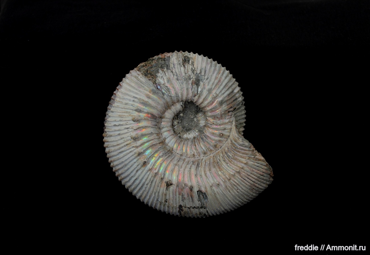 Не идеальный, но очень мне полюбившийся аммонит, с практически целой жилой камерой и хорошо сохранившимся перламутром. После извлечения перламутровый слой имел нежный, равномерно розовый цвет,но после высыхания он превратился в белый порошок, который местами осыпался и обнажил следующий, уже радужный слой перламутра на латеральной стороне. Довольно хорошо сохранились очень хрупкие шипы.