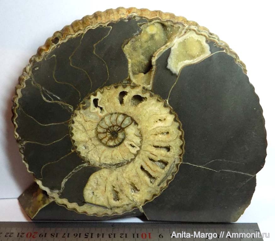 Одна сторона аммонита была разрушена. Пришлось сделать продольный срез.