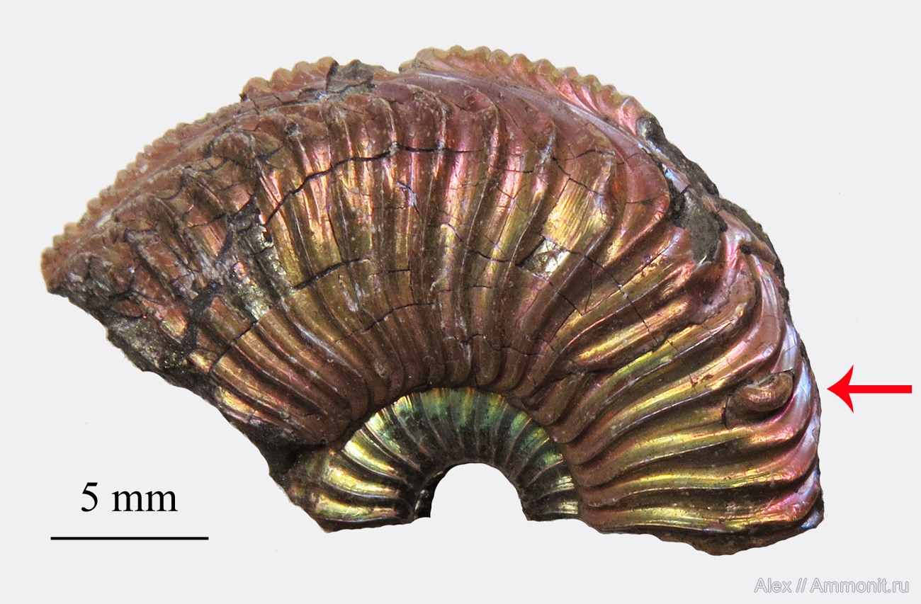 Здесь на фото видно пробитое в раковине небольшое отверстие, которое аммонит залечил довольно неаккуратной выпуклостью (отмечено стрелочкой). Дополнительное фото заплатки. Не знаю, то ли мантия случайно так выпятилась при залечивании отверстия, то ли аммонит пытался воссоздать бугорок, бывший на этом месте. Чуть впереди (через два ребра) виден след обычного устьевого укуса, залеченного аммонитом. Скорее всего дырка в раковине появилась одновременно с тем укусом, при нападении небольшого хищника. Так что заплатку аммониту пришлось ставить совсем недалеко от устья.