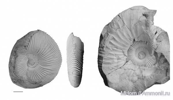 Это - ещё один странный аммонит, найденный в минувшем году на реке Хете. Он был встречен в обнажении на левом берегу Хеты примерно в 200-300 м выше устья ручья Букатый (обн. 18-19 по Саксу). Из других аммонитов в этом обнажении были встречены исключительно верхневолжские формы, но этот аммонит ни на что верхневолжское решительно непохож. Впрочем, и на неотоллию (нижний валанжин) он похож лишь внутренними оборотами (которые также очень напоминают внутренние обороты келловейских Longoceras), и, честно говоря, я я пока затрудняюсь сказать, к какому семейству надо относить эту находку и каков её возраст. Может быть, в этом как-то поможет изучение лопастной линии