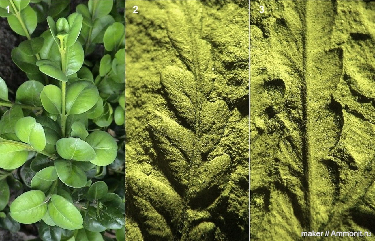 Очевидная вешь - 3D отпечаток листа. К примеру Neuropteris и ещё Neuropteris или Mariopteris. Листочки как живые, так и хочется потрогать. А иногда они "вогнутые" (3)... В общем ключевое слово - отпечаток. Тонкий слой вещества листа разрушен при раскалывании породы и рассеян. И что же имеем? На врезке (1) приведена "нужная" форма листа для образования выпуклого 3D отпечатка. Это изогнутые лодочкой листья самшита. И хотя это покрытосеменное - сути процесса не меняет. Формирование выпуклого 3D отпечатка (2) аналогично вылеплеванию фигурок на песке с помощью детских формочек. Вогнутая поверхность листа формирует выпуклую песчаную фигурку-оттиск. Однако такие отпечатки искажают вид листа растения. Рисунок на выпуклом отпечатке отображает нижнюю сторону листа как бы на внешней... То же самое с "вогнутыми" (3) отпечатками. На таком отпечатке (3) отображена внешняя сторона листа на вогнутой поверхности отпечатка. В общем в обоих случаях дурилка))). Но красиво))).