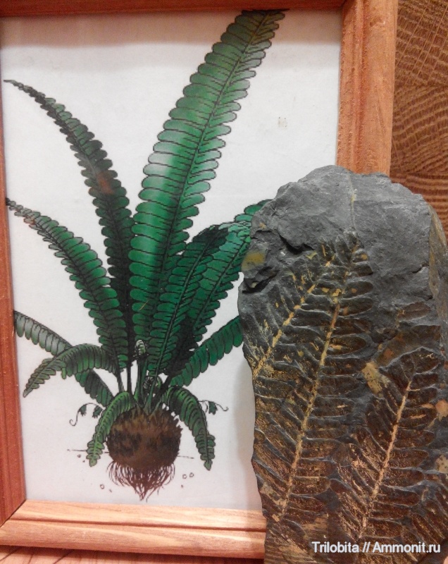 Тут немного подмена понятий. На реконструкции да, папоротник Neuropteridium sp., а на породе птеридосперм Neuropteris sp.. | ||||||