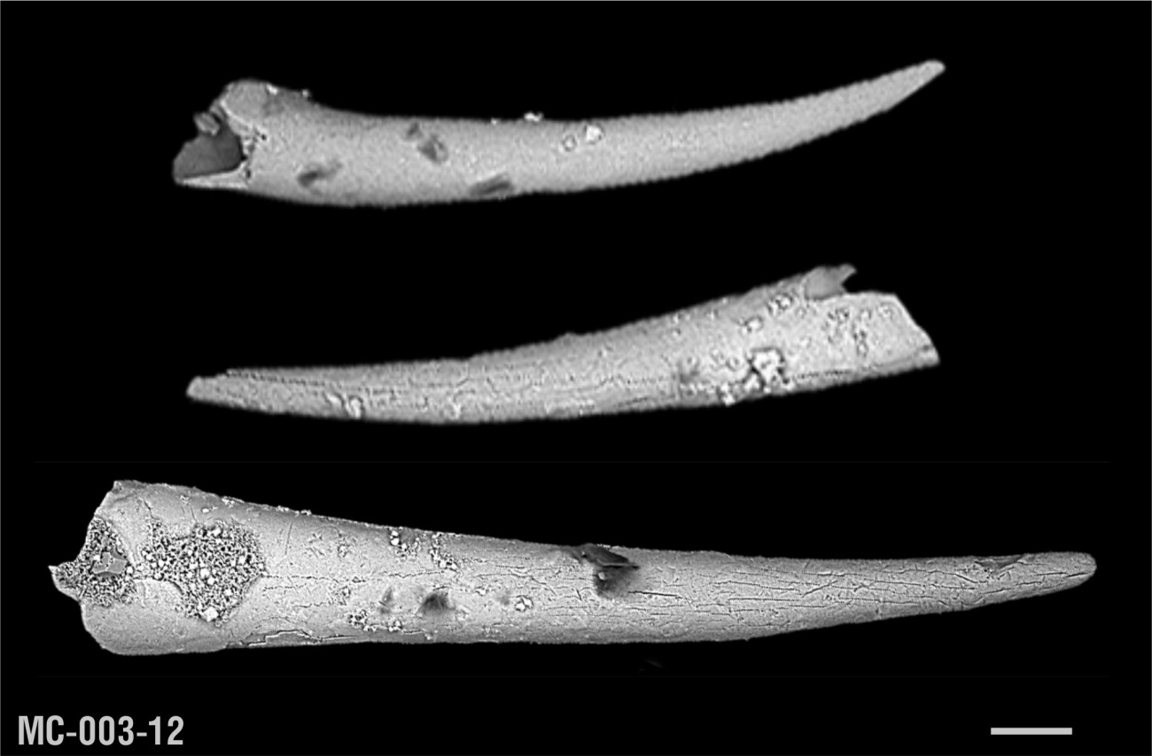 Эти объекты извлечены с помощью уксусной кислоты из доломитов фамена, р-н г.Мценска Орловской обл. Сложены полупрозрачным светло-коричневым фосфатом кальция (апатитом). Имеют центральный достаточно широкий канал. РЭМ, длина масштабного отрезка 0,1 мм.