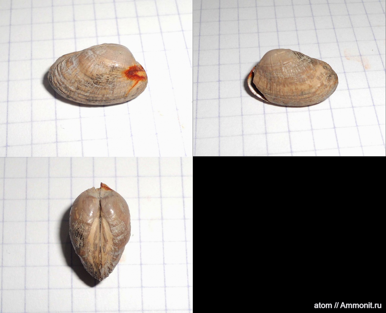 Двустворка Nucula с очень "болезненным" видом. Створки моллюска росли с изъяном.