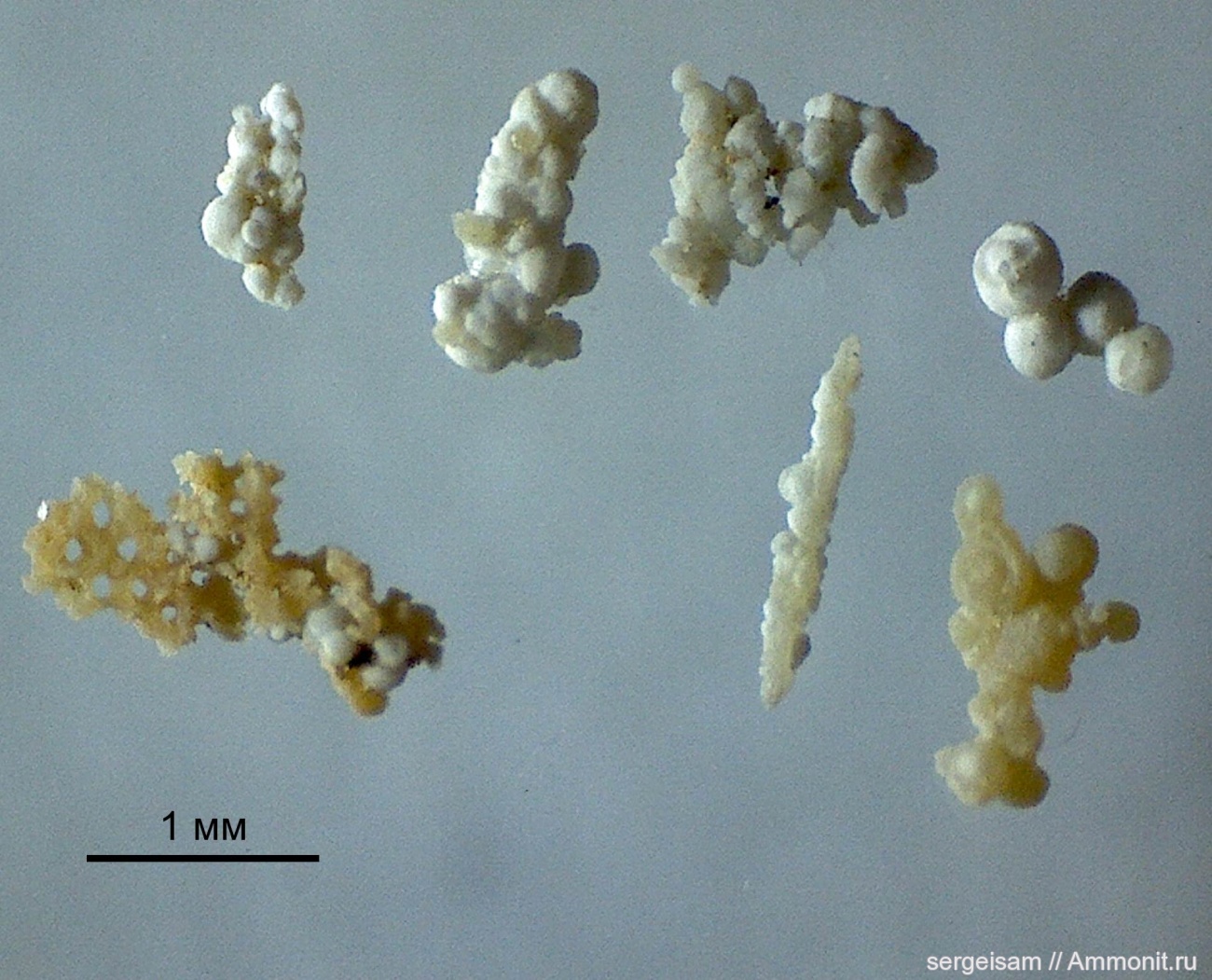 Вот честно говоря не уверен, что это фораминиферы. На фораминиферу тут похож только образец справа вверху, состоящий из четырех шариков. Образец над масштабным отрезком больше напоминает кусочек мшанки, а все остальное на мой взгляд - чистая геология. | ||||||
