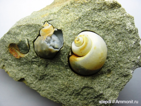 Халцедонизированные внутренние ядра гастропод в породе. Размер большего ядра около 17 мм. В ультрафиолете халцедон флуоресцирует ярко-белым светом. Интересны натечные образования голубовато-серого халцедона внутри меньшего ядра. Образец получен от Сергея Сергеева (nyxx). Место находки - Шиханы (Вольск-18), Саратовская область. Возраст - палеоген. Обычно в коллекциях встречаются ядра другого вида наподобие этого.