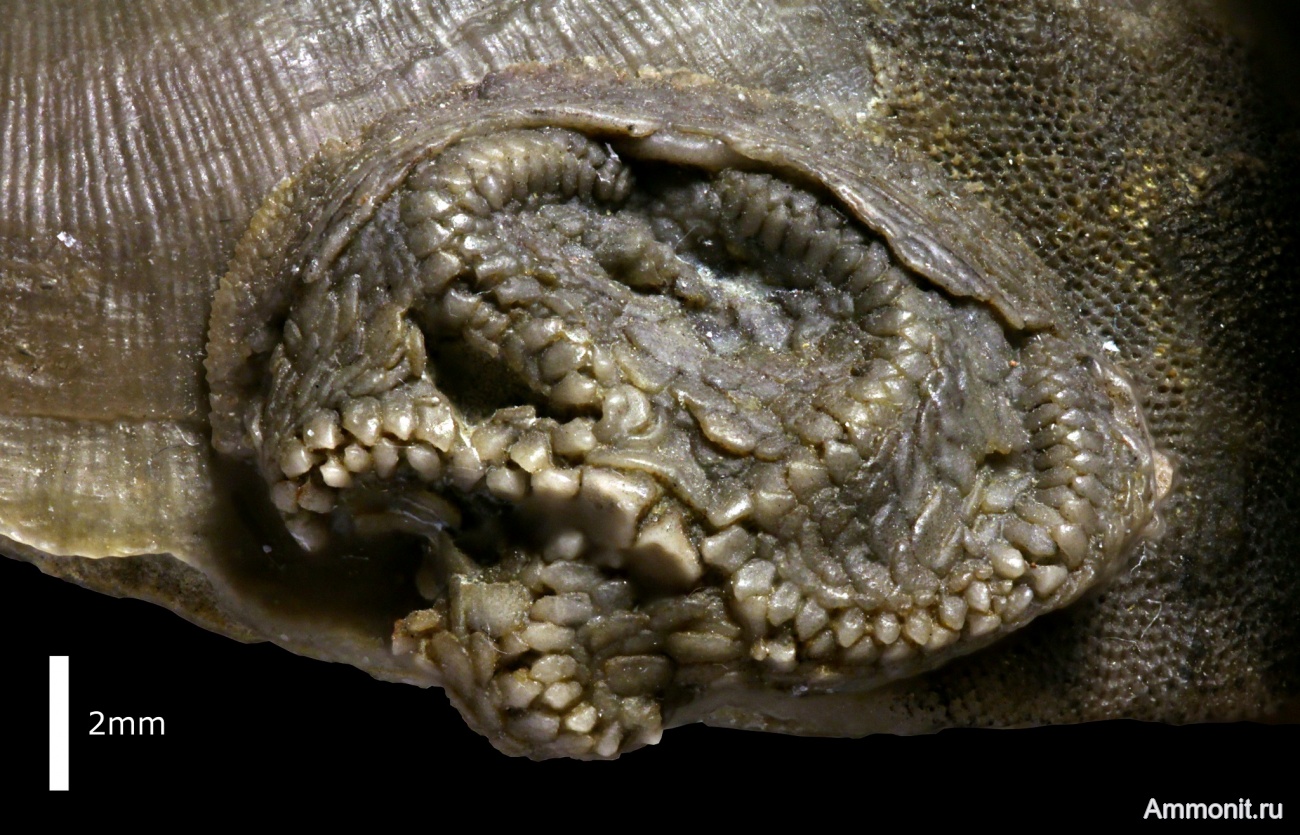 И этот экземпляр прирос ещё поверх мшанки. Интересно, он ещё при жизни брахиоподы на ней поселился или это посмертное обрастание (плохо видно, как плёночка мшанки расположена относительно края створки). | ||||||