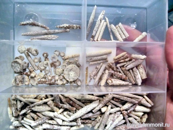 В светлых глинах, чуть ниже гжельского горизонта в изобилии встречаются запчасти морских ежей и лилий, пробывал разбирать большие пласты глин на подобие наших плиток Оксфорда, но целых панцирей ежей на матриксе обнаружить не удалось.В конце концов я хотел набор игл каменноугольных ежей и набрал их с избытком.)
