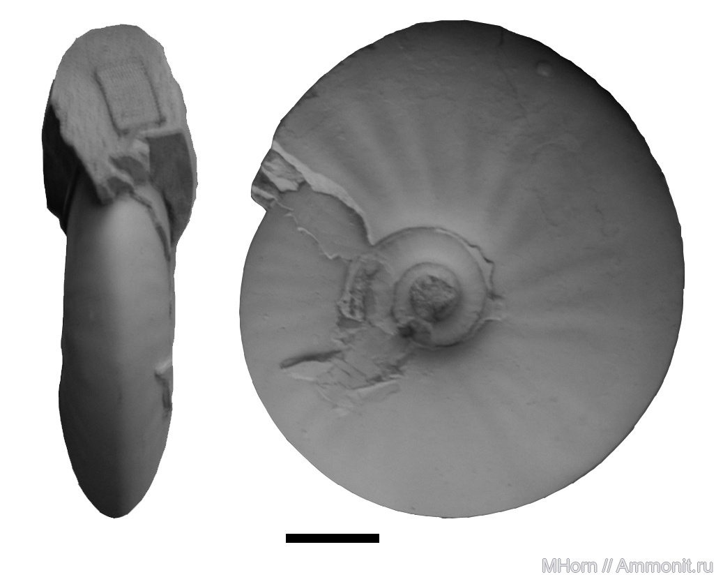 Это - голотип (и одновременно единственный известный представитель) вида Volgidiscus pulcher, найденного в скважине, пробуренной на р. Волье (Приполярный Урал). Он по идее должен был храниться в монографическом музее ВНИГРИ под номером 1857/634, но по факту был найден мной в 2012м году среди неразобранных образцов Месежникова, и тут же опознан. К сожалению, снимался он в не самых лучших условиях, и вид с вентральной стороны оказался не в фокусе