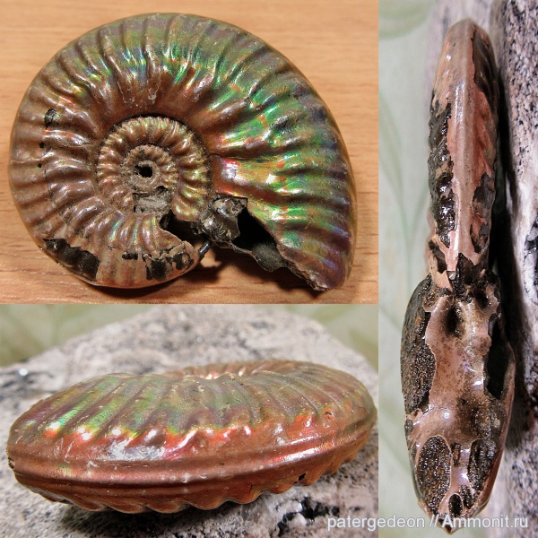 Шикарный аммонит! И перламутр красивый, и даже залеченный покус (на верхнем фото слева) виден. Я думаю, что это Putealiceras - они как раз более ребристые и толстые. | ||||||