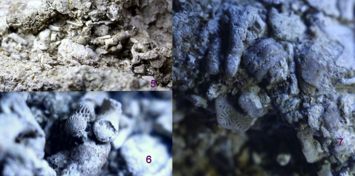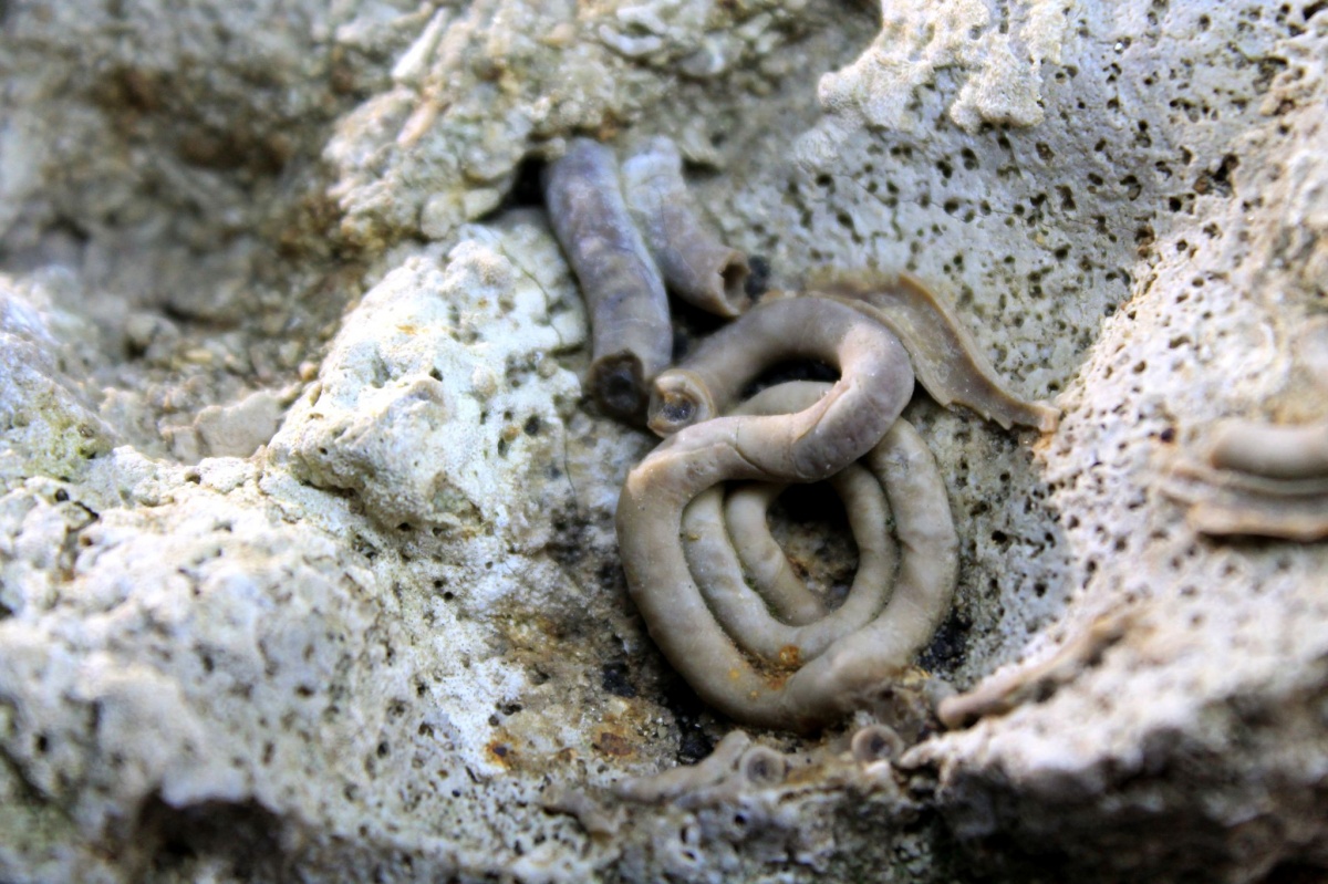 Не могла не показать этих откормленных червячков :), сечением почти 2 мм. Располагаются на довольно интересной породе. То есть такую породу мы уже видели (спрессованный песчаник), но совсем пустую. А тут в ней намешано всякое разное (правда все очень маленькое). Есть всякая мелочь и членики стеблей лилий (3 мм) фото и, как я думаю, фрагменты мшанок фото.