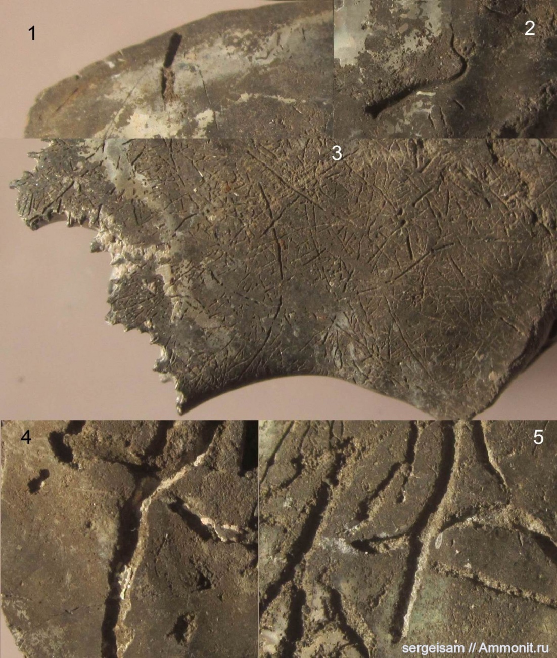 Я как-то привык считать дно оксфордовского моря в подмосковье совсем безжизненным и был удивлен, когда на ядрах жилых камер аммонитов Amoeboceras нашел следы червей, живших внутри жилых камер после смерти их хозяев. Из 46 обследованных раковин только одна не имела их явных следов. Большая часть раковин покрыта сеткой ходов диаметром 0,1-0,2мм, как на рисунке 3. Такая плотная сетка ходов бывает только на одной стороне, на противоположной стороне их значительно меньше или вообще нет. Иногда обе стороны испещрены ходами одинаково, надо полагать в этом случае раковина легла на дно вентральной стороной и заполнение жилой камеры илом происходило от последней перегородки к устью, поэтому обе боковые стенки оказались одинаково обитаемы.