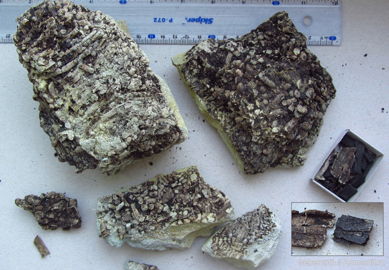 Это обломки одного фрагмента, общей длинной примерно в полметра. Сильно разрушен эрозией, что с одной стороны даже хорошо - я бы не решился его раскалывать, найди я его свежим и в отличном состоянии. Остатки древесины хорошо сохранили структуру волокон, и имеют сильное сходство с древесиной современных хвойных. Остатков самих моллюсков пока не обнаружил и обнаружу навряд ли, в связи со спецификой захоронения. Впрочем, буду надеяться - кроме приведенных на фото есть еще уйма более мелких фрагментов и отдельных ходиков на сбор которых пришлось потратить не меньше полутора часов.