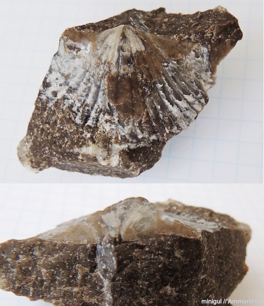 Это Spiriferida. Спинная створка. Правильно не "валики", а рёбра. Валики это элемент внутреннего строения, например: "валики брахиальные", "в. кардинальные", "в. кольцевые", "в. латеральные", "ограничивающие", "приямочные".. И характерно всё это для отряда Productida. | ||||||
