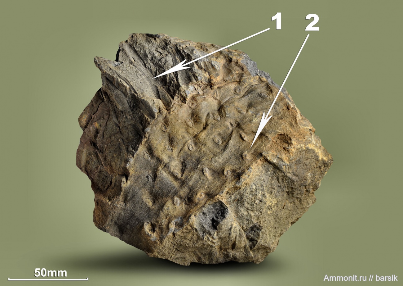 Это третий, на котором хорошо видно тонкие придаточные корни или аппендиксы(1), которые с помощью пупковидных рубцов (2), крепились к корненосцу.