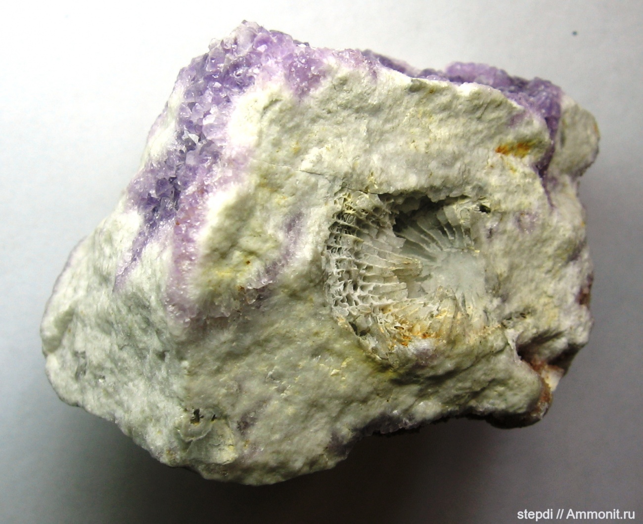 Щетка кристаллов аметиста на породе, содержащей остатки ругозы. Замещение халцедоном. Размер коралла около 25 мм. Комсомольское, Донбасс. Возраст - карбон.