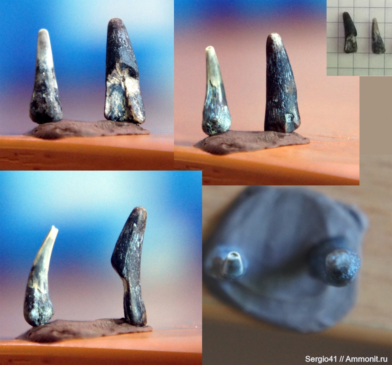 Слева наверняка акула: (эмаль выдает). А вот спарава: и форма - у рыбы больше лингванльно-лабиально симетрична при виде сверху. Плюс струйчатость по всей окружности не свойственна акулам. Заодно внутренний конус со стороны корня (см. скол) не свойственный акулам, (можно добавить фото базально ,но его и так видно из за скола...) стандартный для рептилий. Да еще и режущая кромка видна. Все как обсуждалось на моих фото кроков из танета (камышинская свита). | ||||||