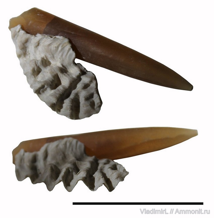 Лофа приросла к белемниту. Вот похожая, но только приросла к бакулиту https://www.ammonit.ru/foto/53332.htm | ||||||