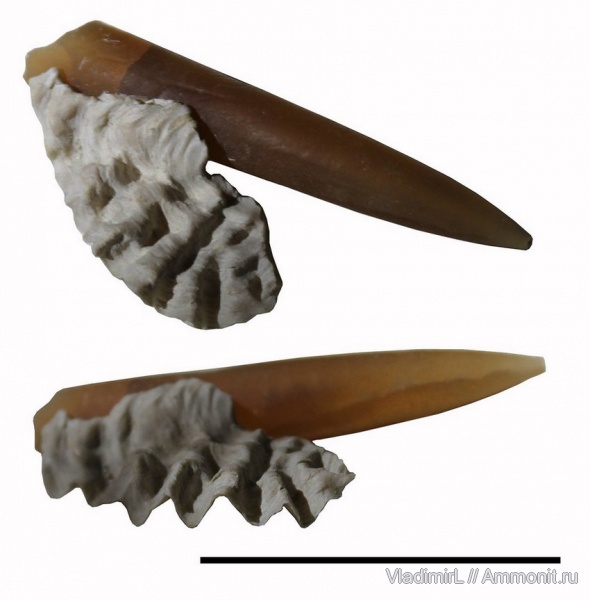 Здесь представлена устрица, предварительно определенная как Lopha sp., обросшая ростр молодой особи Belemnitella mucronata. К сожалению, эти находки были найдены не в сочленённом состоянии, а в осыпи, рядом друг с другом. Но такое явление довольно часто для устриц этого местонахождения, и вполне увереннно сопоставляется по размеру и форме с рострами молодых белемнитов, обнаруживаемых там в огромном количестве. Кроме того, подобные обрастания белемнитов устрицами отмечались и в литературе, например в [Л.Н.Якушин, А.В.Иванов, Краткий атлас позднемеловых двустворчатых моллюсков (Ostreoida, Pectinoida) юго-востока Восточно-Европейской платформы].