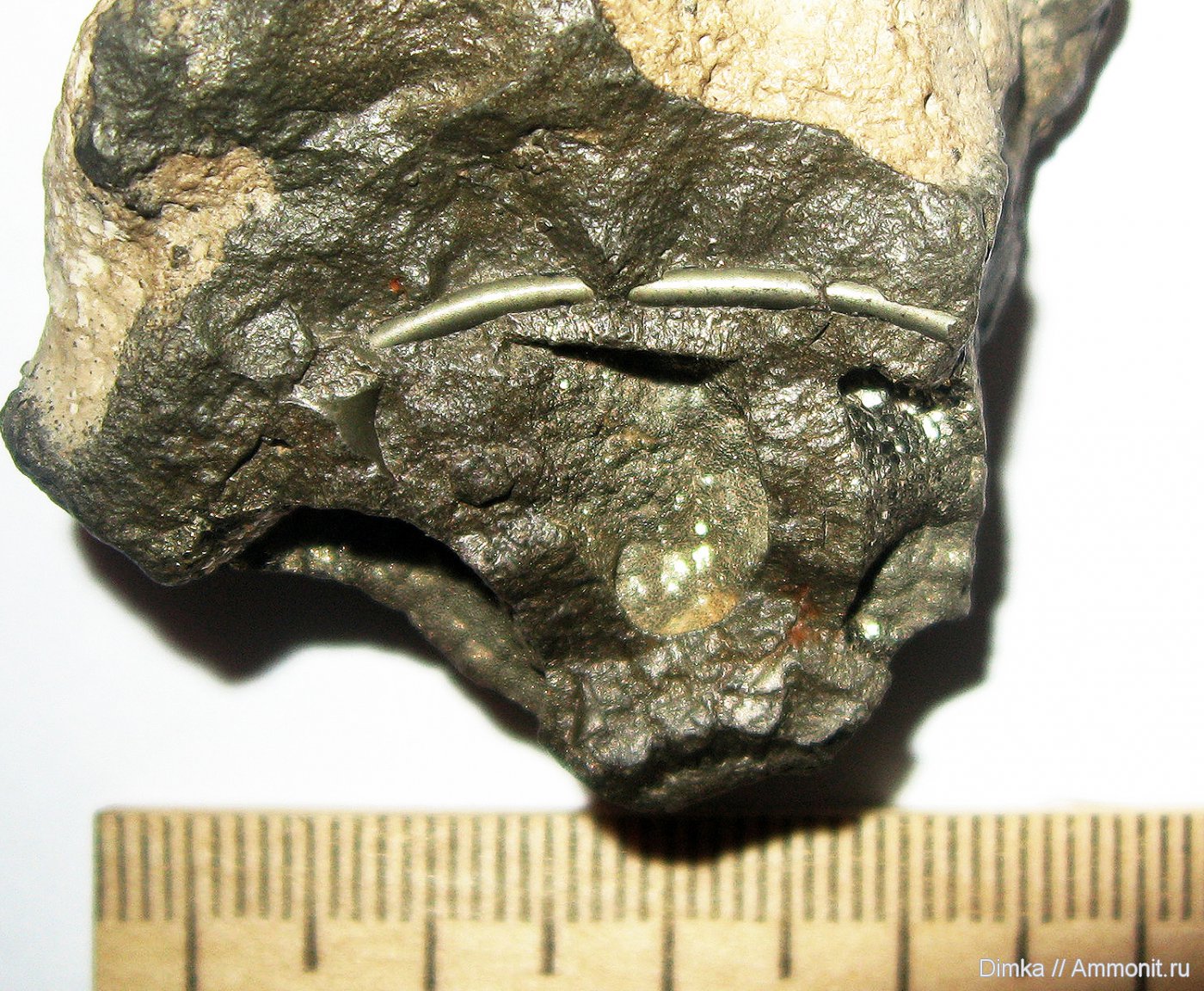 В расколотом куске раковины благодаря пиритизации хорошо сохранился фрагмент сифона аммонита. Найден у г. Кимры, в.келловей-н.оксфорд.