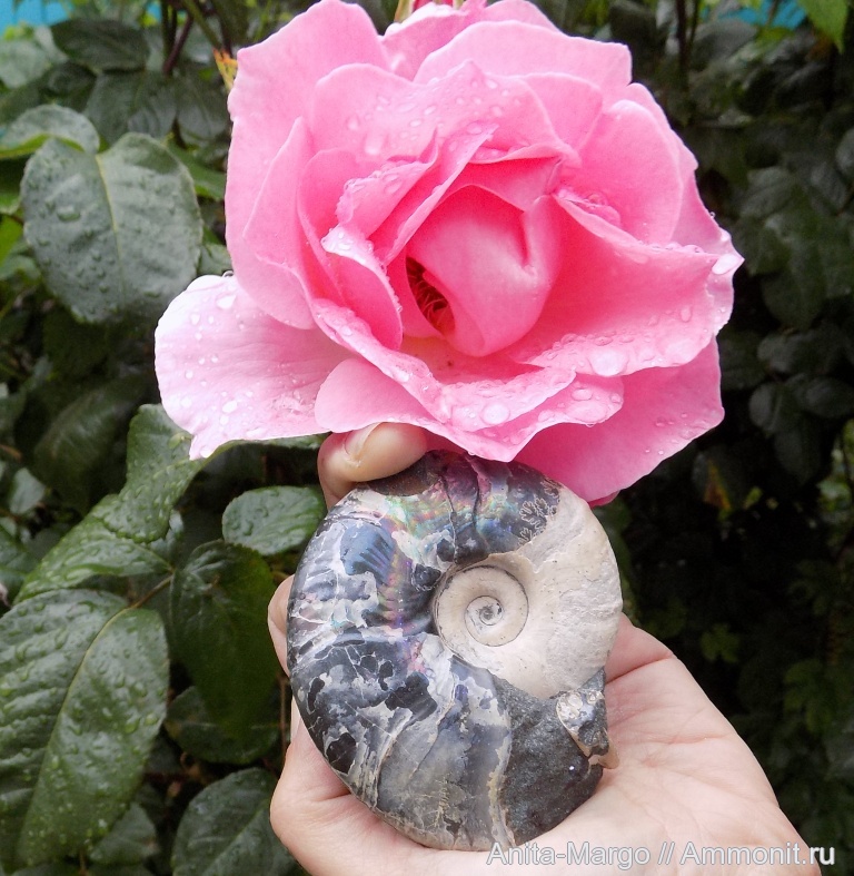 Красота! Цветущую розу в качестве масштаба еще никто по-моему не использовал )) Но главное что в тексте масштаб указан, так что размер аммонита понятен. А аммонит хорош - с полной жилой камерой. | ||||||