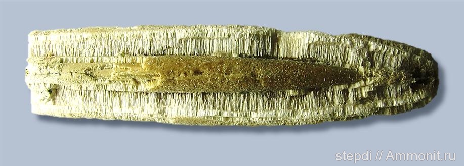 Вот такой интересный ростр белемнита получил по обмену из г. Пенза. Замещен игольчатыми кристаллами арагонита, имеет многослойную структуру ("ростр в ростре"). Замещение ростров игольчатым арагонитом - явление довольно редкое: встречается у белемнитов из штата Нью-Джерси в США. Длина ростра около 55 мм. Найден в обрыве на берегу озера в Пензенской области среди песка и глины. По геологической карте в этом месте на поверхность выходят отложения верхнего мела (K2). Арагонитовые ростры встречаются на небольшом участке площадью около 1 кв. метра.