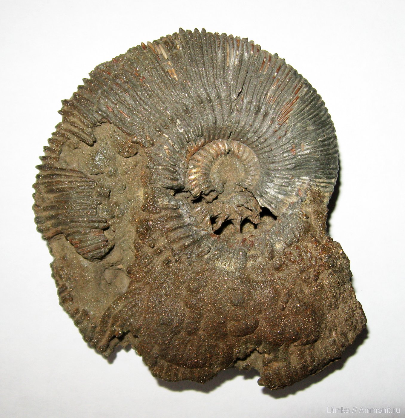 Kosmoceras из верхнего келловея. Раковина сильно покрыта пиритом. Диаметр около 8 см.