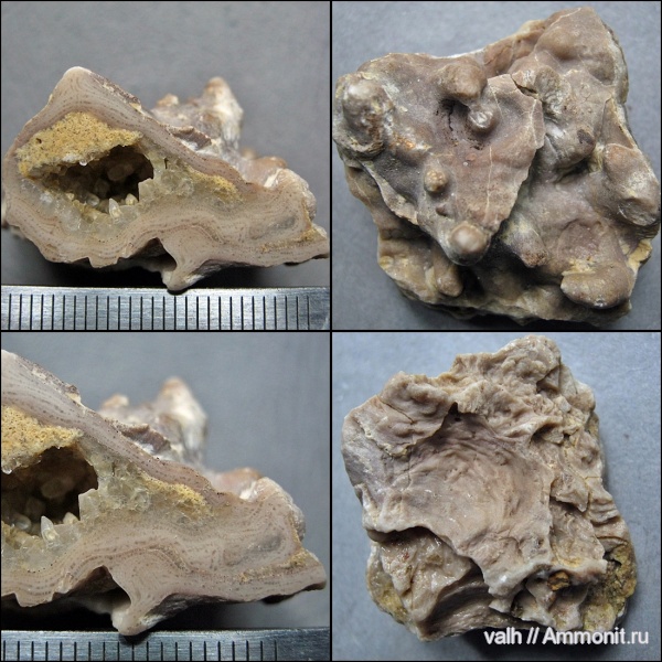Образец подарен мне Галиной (toltek) для опознания.Определить мне точно его не удалось. Есть что то общее с Clathrodictyon,рельеф поверхности,астрориз как таковых не видно,в срезе есть сходство.Внутри образца оказалась полость заполненная кальцитом ,да и сам срез на фоне кристаллизации кальцита выглядит не очень контрастно.Внизу приложена линеечка с делениями в миллиметр.Можно получить представление о расстоянии между ламелями.Видно также вертикальные каналы на выпуклых частях рельефа.