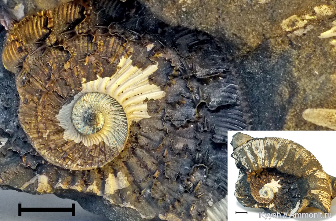 фрагмент перламутрового противоотпечатка Virgatites gerassimovi с лопастными линиями