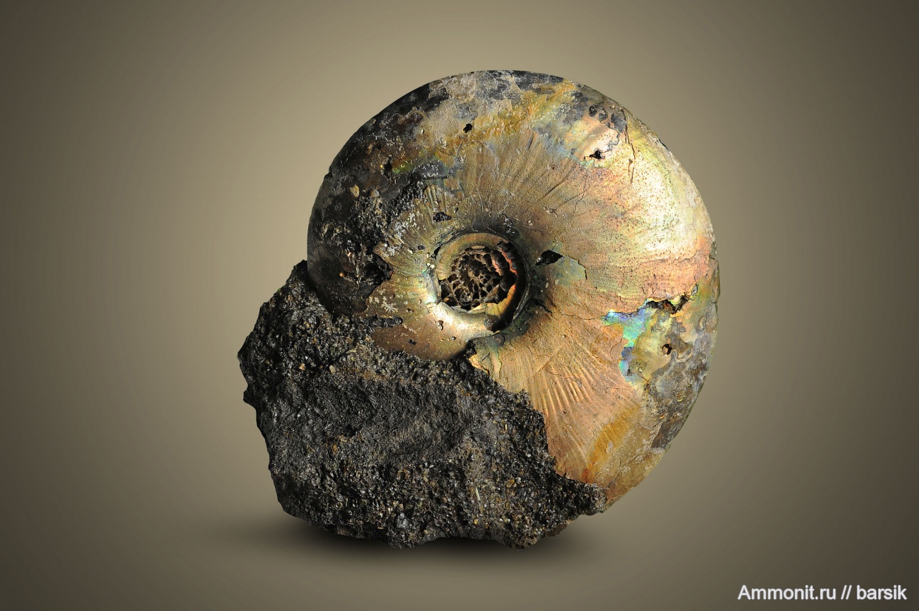 Странные аммониты - абсолютно простая гладкая раковина, но притягивает взгляд. Цвета перламутра у каждого аммонита свои, яркие и неповторимые. Эти Garniericeras –ы напоминают тропических бабочек.
